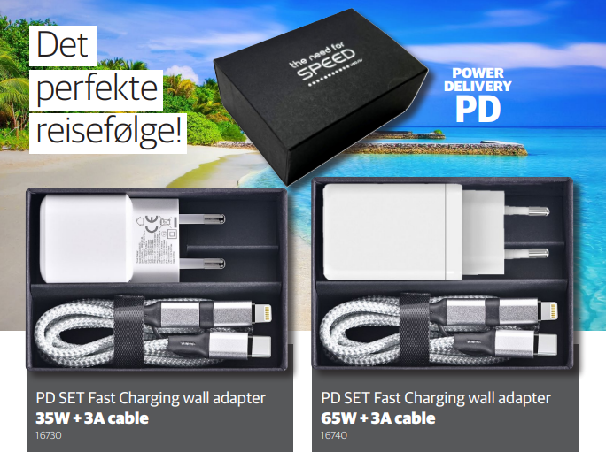 Priser inkluderer trykk på adapter, eske og gravert logo på ladekabel. En perfekt gave eller markedsføringsartikkel. Invester i en ladeløsning som leverer kraft, hastighet og det